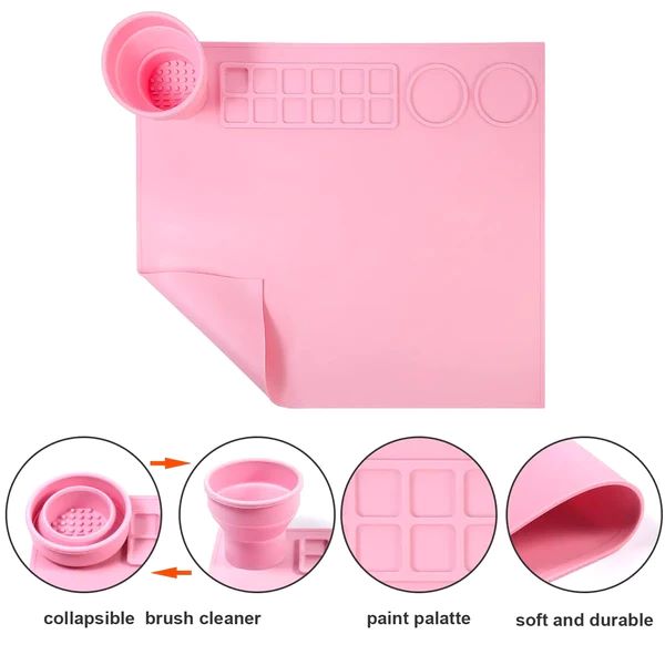 Onze allereerste mat met een ingebouwde opvouwbare borstelreinigingsbeker. De borstelreinigerbeker is ontworpen om water vast te houden en penselen schoon te maken.