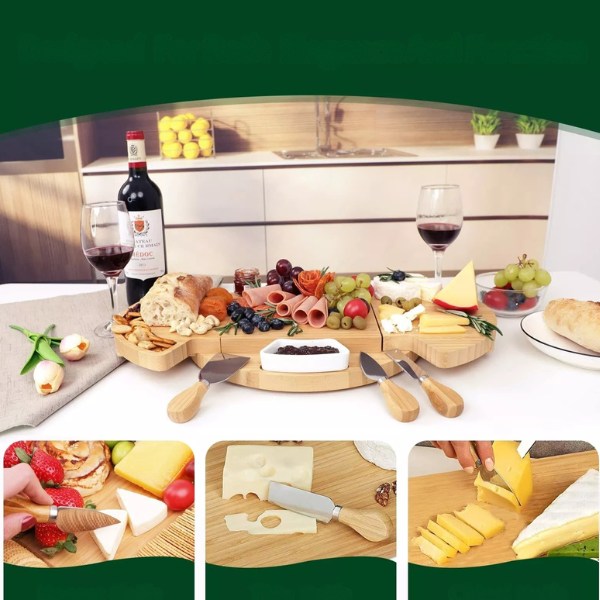 De plank wordt geleverd met 3 keramische kommen en 3 roestvrijstalen gereedschappen. Gebruik het meegeleverde mes, de spatel en de vork voor het snijden en serveren, terwijl de kommen netjes olijven, noten of dips bevatten – alles wat u nodig heeft in één set.