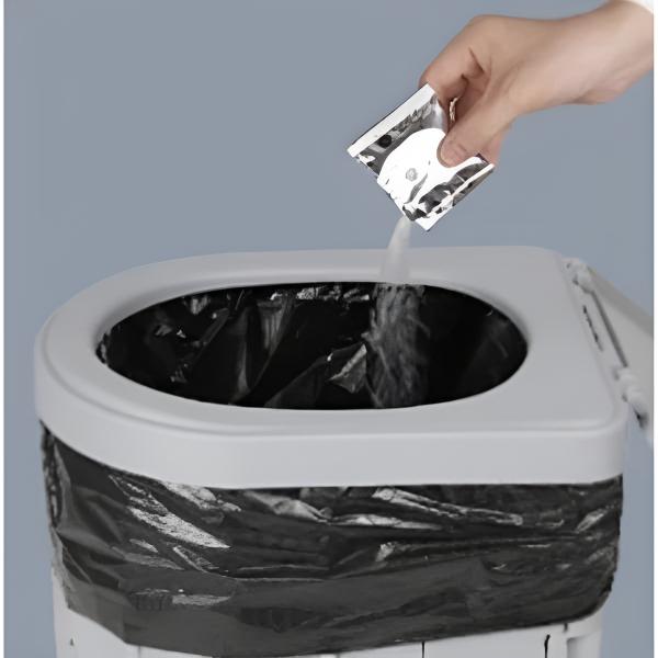 Doe gewoon het geurneutraliserende poeder in de tas en je kunt het toilet gebruiken waar en wanneer je maar wilt.