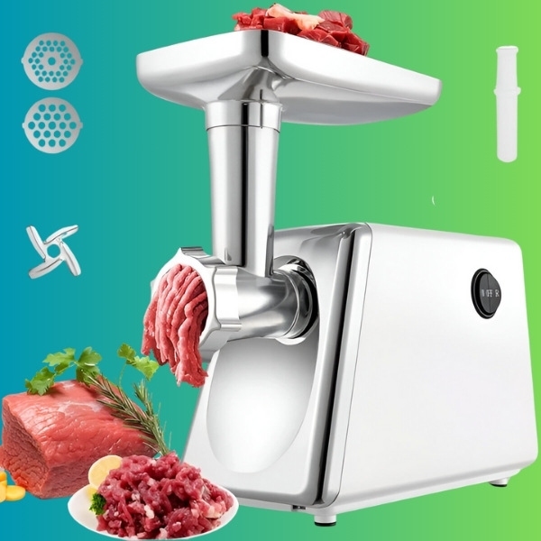 📦 Elektrische vleesmolen + voedselduwer + 2x snijplaten + 1x mes