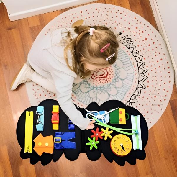 De peuter zal zich bezighouden met ritsen, sluitingen, tandwielen, klokken, schoenveters en nog veel meer.