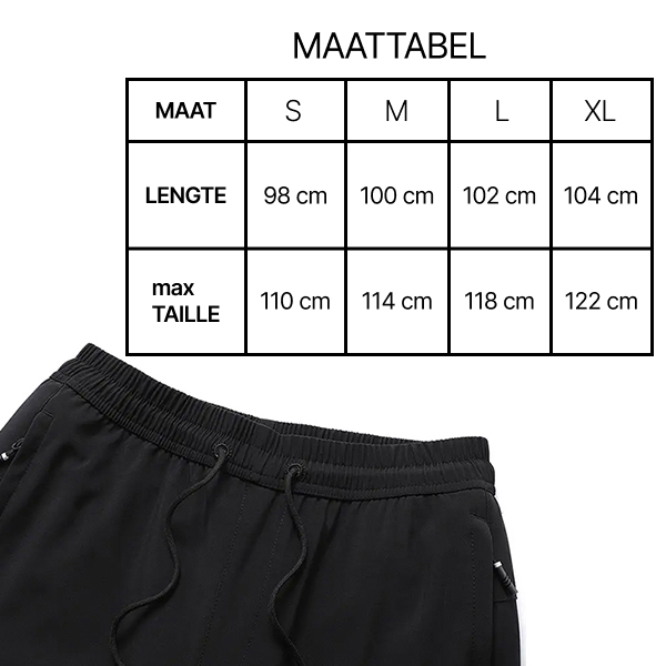 Eigenschappen: Elastische taille met verstelbaar trekkoord, dubbele zakken, sleutelhangerhaak aan achterkant
