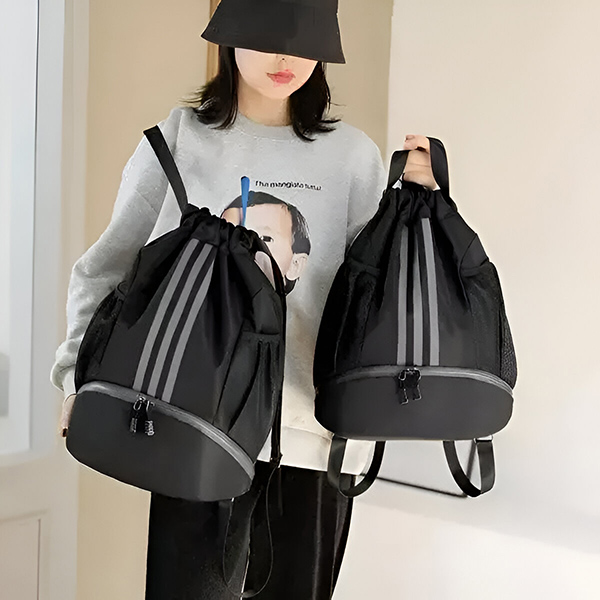 Het grote compartiment met trekkoord is perfect voor het opbergen van gymkleding, schoenen, handdoeken en een waterfles. Er is een specifieke plek voor alles wat je nodig hebt voor een effectieve trainingssessie. Je hoeft niet meer in uw tas te zoeken: alles heeft zijn plaats.