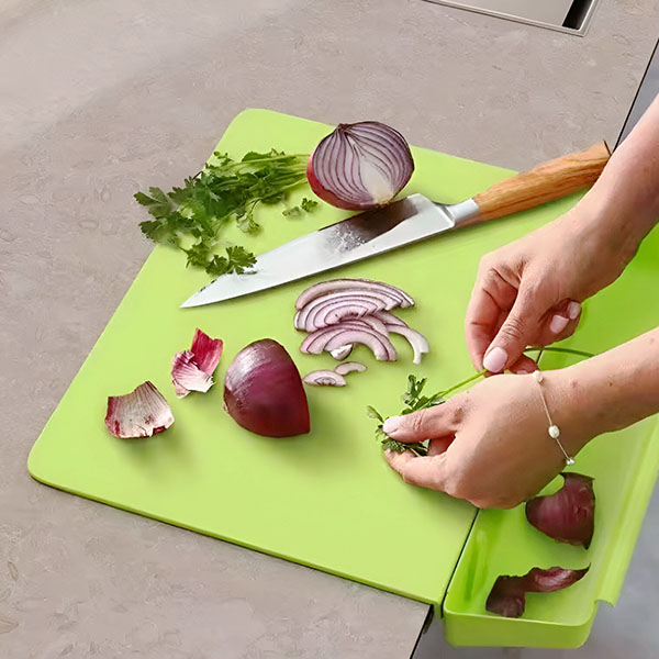 Houd je keuken netjes en efficiënt! 🍅🍴 De afneembare container van deze snijplank vangt al je gehakte ingrediënten op, waardoor het bereiden van maaltijden een fluitje van een cent wordt en je opruimtijd bespaart. ✨ Zeg vaarwel tegen de rommel op het aanrecht!