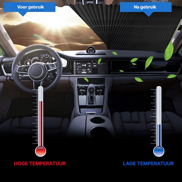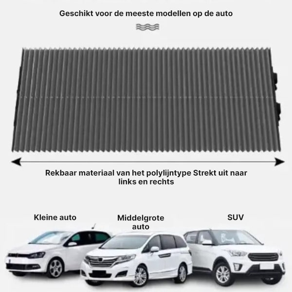 Druk de zuignappen op de voorruit, trek het scherm uit, klik de linker zuignap vast – klaar in minder dan een minuut. Knip de rand eenmalig met een schaar af om hem aan de hoogte van uw voorruit aan te passen en hij past permanent – geen gedoe met bijstellen, geen geklungel en geen problemen met opbergen.