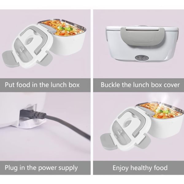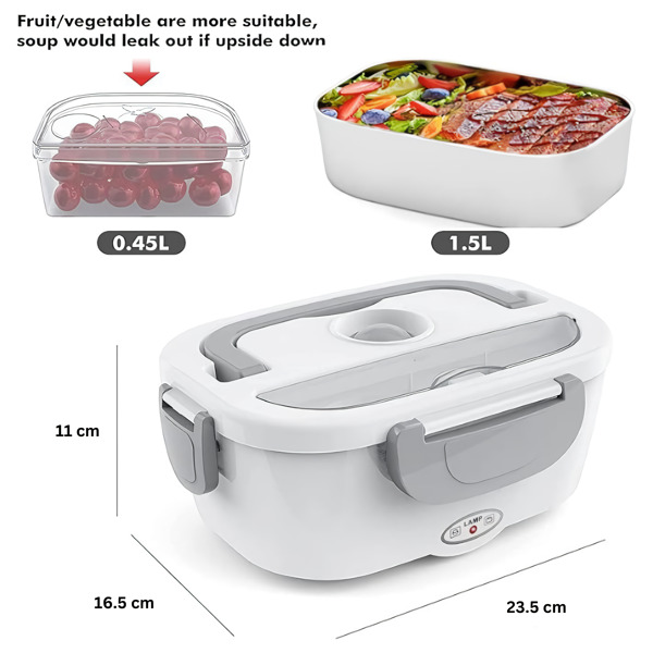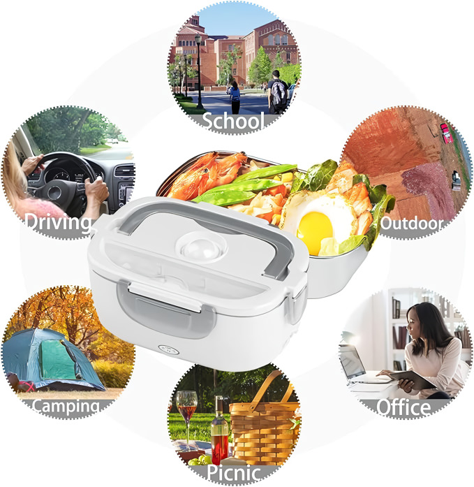 De 2 verwijderbare PP-vakken houden uw hoofd- en bijgerecht gescheiden – en beide gaan daarna direct de vaatwasser in. Werkt op kantoor, in de auto, op een bouwplaats of in elke kamer met een stopcontact.