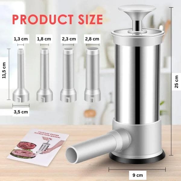 Deze worstvuller bevat vier PP spuitmonden met verschillende diameters: 1,3cm. 1,8cm, 2,3cm en 2,8cm.